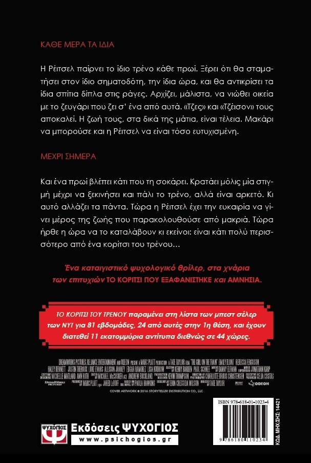 Και μια μέρα βλέπει κάτι που τη σοκάρει. Κρατάει μόλις μία στιγμή μέχρι να ξεκινήσει και πάλι το τρένο, αλλά είναι αρκετό. Κι αυτό αλλάζει τα πάντα. Τώρα η Ρέιτσελ έχει την ευκαιρία να γίνει μέρος της ζωής που παρακολουθούσε από μακριά. Τώρα ήρθε η ώρα να το καταλάβουν κι εκείνοι: είναι κάτι πολύ περισσότερο από ένα κορίτσι του τρένου…