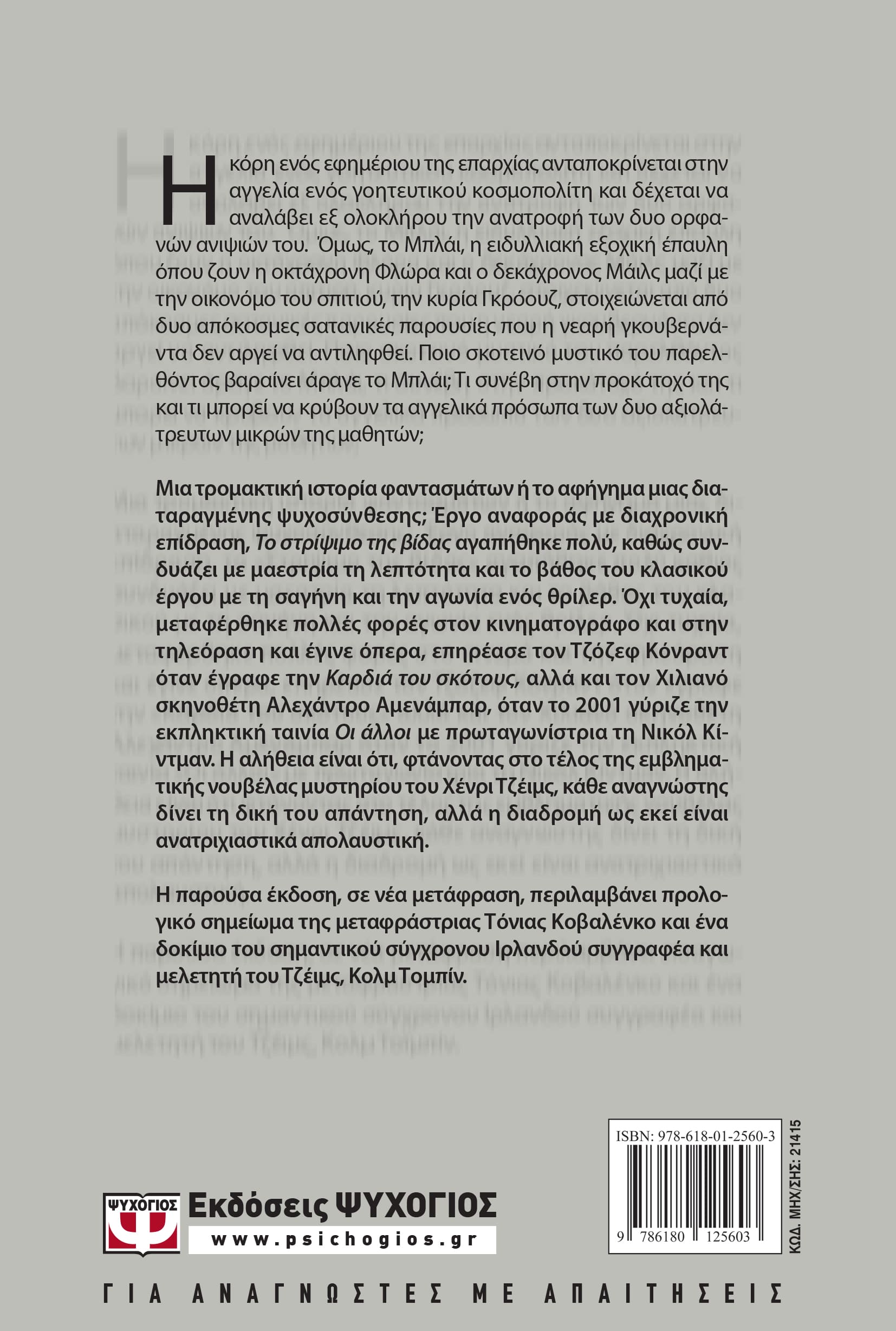 Μια τρομακτική ιστορία φαντασμάτων ή το αφήγημα μιας διαταραγμένης ψυχοσύνθεσης; Έργο αναφοράς με διαχρονική επίδραση, Το στρίψιμο της βίδας αγαπήθηκε πολύ, καθώς συνδυάζει με μαεστρία τη λεπτότητα και το βάθος του κλασικού με τη σαγήνη και την αγωνία ενός θρίλερ. Όχι τυχαία, μεταφέρθηκε πολλές φορές στον κινηματογράφο και στην τηλεόραση και έγινε όπερα, επηρέασε τον Τζόζεφ Κόνραντ όταν έγραφε την Καρδιά του σκότους, αλλά και τον Χιλιανό σκηνοθέτη Αλεχάντρο Αμενάμπαρ, όταν το 2001 γύριζε την εκπληκτική ταινία Οι άλλοι με πρωταγωνίστρια τη Νικόλ Κίντμαν. Η αλήθεια είναι ότι, φτάνοντας στο τέλος της εμβληματικής νουβέλας μυστηρίου του Χένρι Τζέιμς, κάθε αναγνώστης δίνει τη δική του απάντηση, αλλά η διαδρομή ως εκεί είναι ανατριχιαστικά απολαυστική.