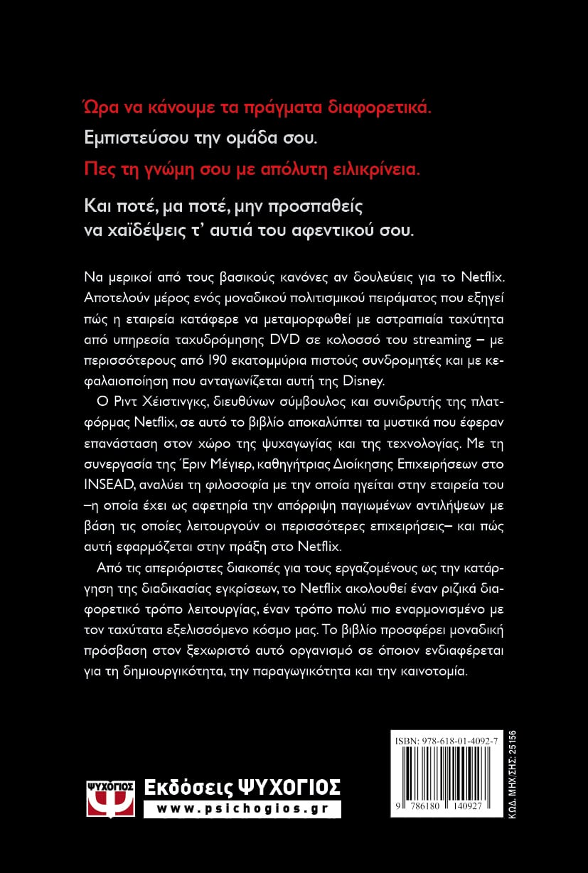 Ο Ριντ Χέιστινγκς, διευθύνων σύμβουλος και συνιδρυτής της πλατφόρμας Netflix, σε αυτό το βιβλίο αποκαλύπτει τα μυστικά που έφεραν επανάσταση στον χώρο της ψυχαγωγίας και της τεχνολογίας. Με τη συνεργασία της Έριν Μέγιερ, καθηγήτριας Διοίκησης Επιχειρήσεων στο INSEAD, αναλύει τη φιλοσοφία με την οποία ηγείται στην εταιρεία του –η οποία έχει ως αφετηρία την απόρριψη παγιωμένων αντιλήψεων με βάση τις οποίες λειτουργούν οι περισσότερες επιχειρήσεις– και πώς αυτή εφαρμόζεται στην πράξη στο Netflix.