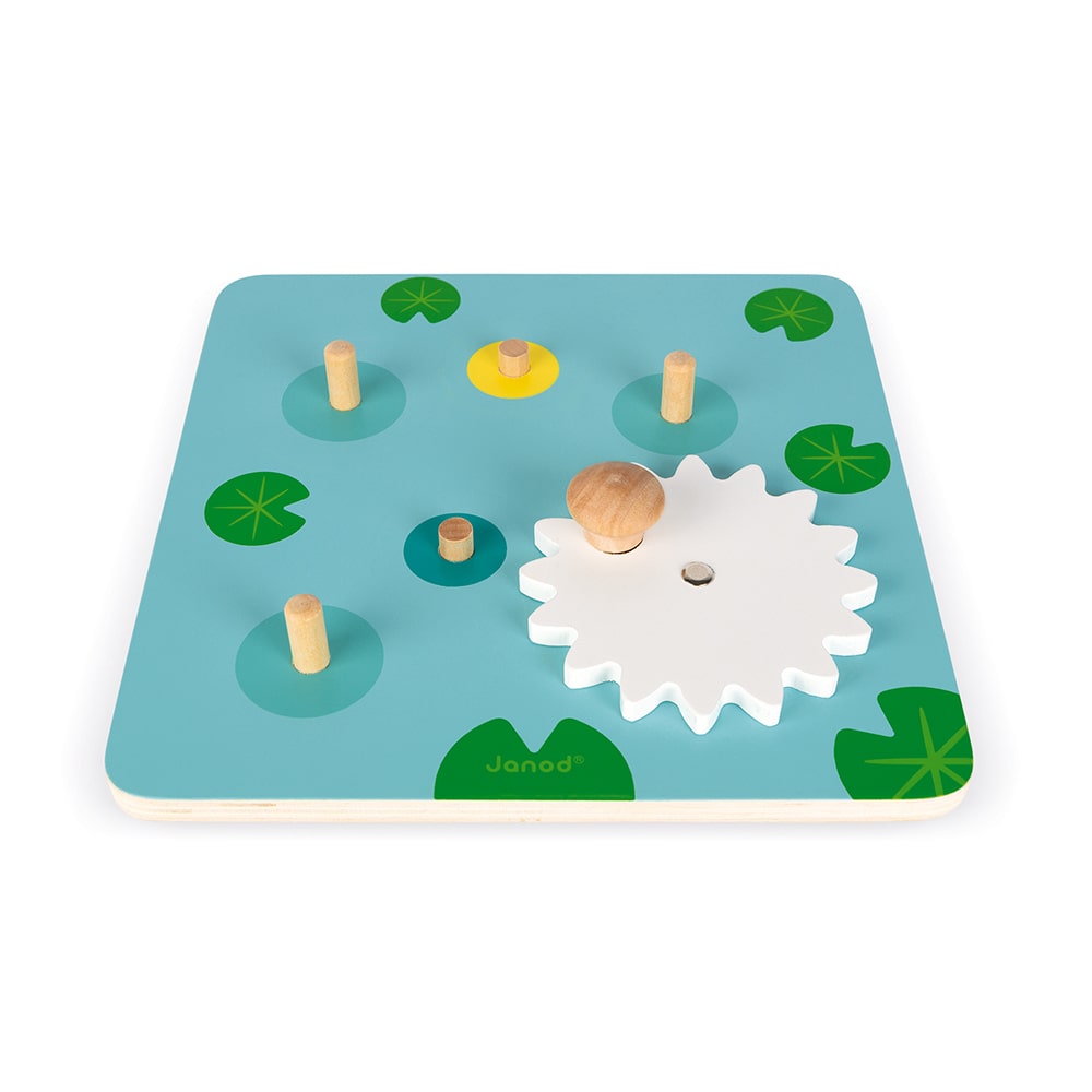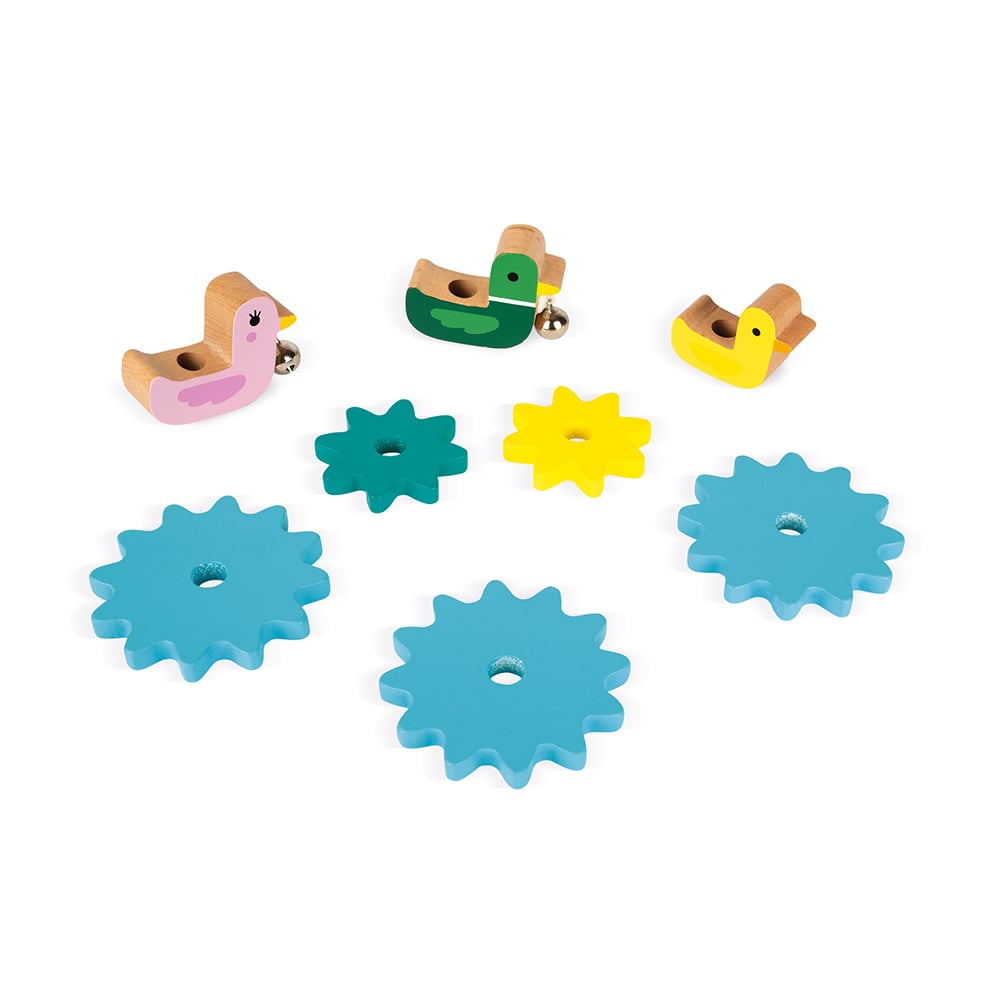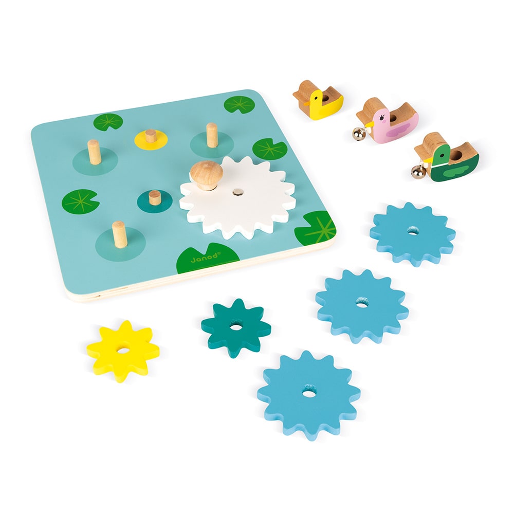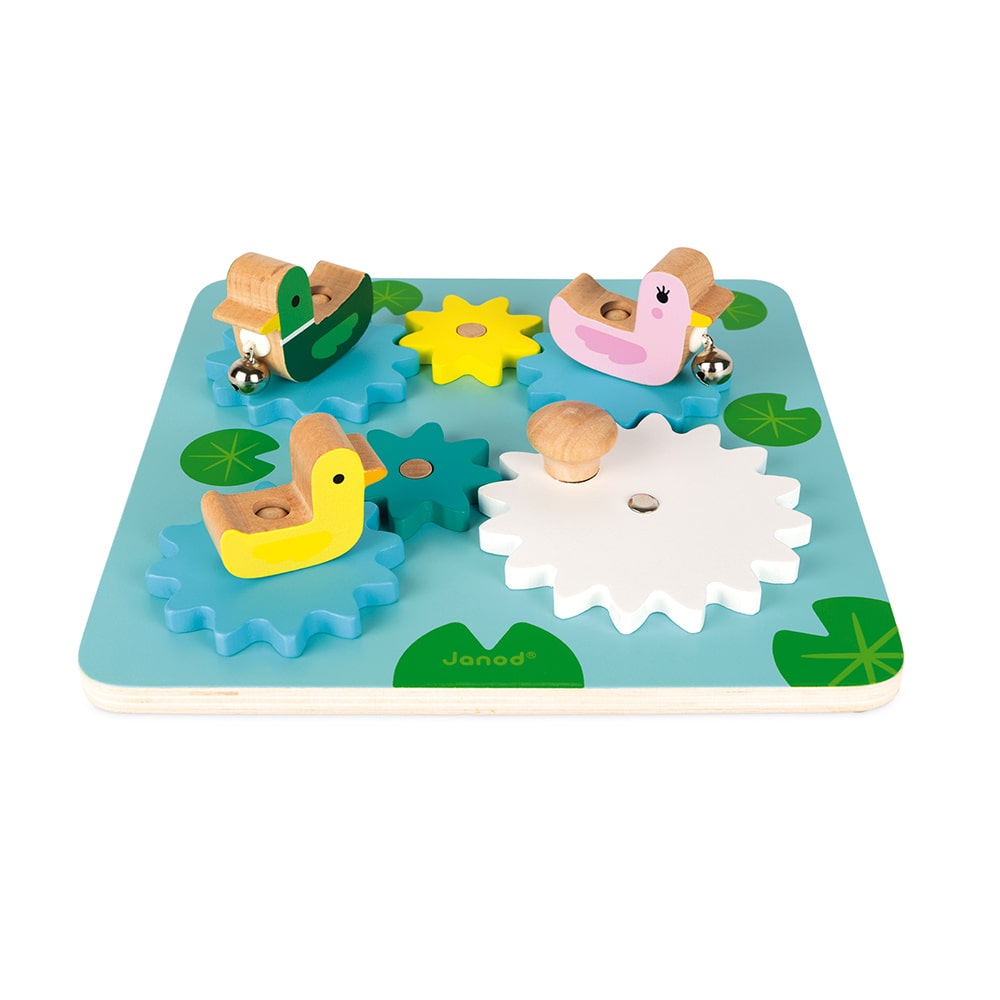Καλλιεργήστε την επιδεξιότητα και τη μνήμη του παιδιού σας με αυτή την όμορφη λίμνη με πάπιες. 6 γρανάζια για συναρμολόγηση και χρήση και 3 όμορφες πάπιες με κουδούνι που κουδουνίζει. Αντιολισθητική βάση. Ξύλο: κόντρα πλακέ για τη βάση και μασίφ ξύλο για τις πάπιες. Εκτύπωση: θερμοτυπία. Συσκευασία δώρου.