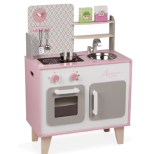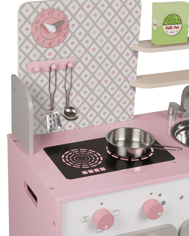 Η ξύλινη κουζίνα Macaron σε ροζ παστέλ χρώμα είναι ο καλύτερος τρόπος ώστε το παιδί να κάνει τα πρώτα του βήματα στη μαγειρική διασκεδάζοντας. Είναι μια μικρογραφία της πραγματικής κουζίνας, με πάγκο στο ύψος του παιδιού (50 εκ.). Διαθέτει ρολόι κουζίνας, μεταλλικό νεροχύτη, κρεμάστρα για τις κουτάλες, 2 περιστρεφόμενα κουμπιά για τον φούρνο και την εστία της κουζίνας, σκεύη και υλικά μαγειρικής και έξτρα χώρους αποθήκευσης. Κατάλληλο από 3 ετών.
