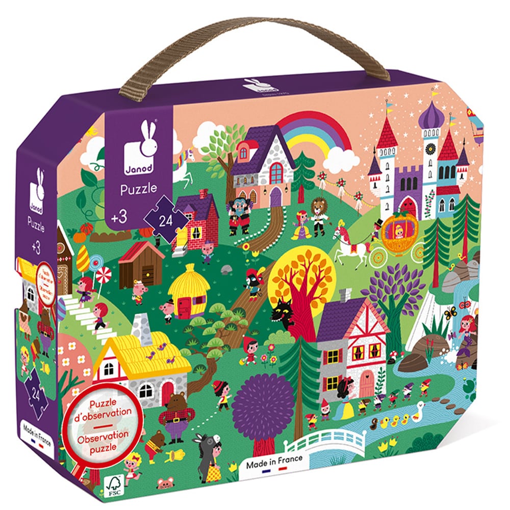 Ανακαλύψτε ένα όμορφο παζλ από χαρτόνι 24 τεμαχίων, με φανταστικές εικονογραφήσεις με θέμα τα παραμύθια. Το μέγεθος των κομματιών είναι κατάλληλο για μικρά χέρια για να διευκολύνει την ολοκλήρωση του παζλ. Μόλις τελειώσετε το παζλ, διασκεδάστε παίζοντας με το να βρείτε τις 29 κρυμμένες εικόνες! Με την όμορφη όμορφη μικρή θήκη με χερούλι, έχετε εύκολη μεταφορά και τακτοποίηση και έτσι δεν χάνετε ποτέ τα κομμάτια!