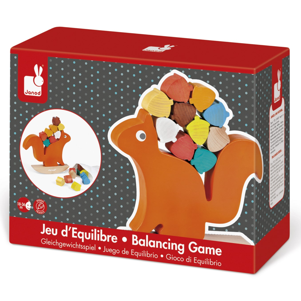 Ξύλινο παιχνίδι ισορροπίας. Βαφή νερού. Συμπεριλαμβάνει ένα σκιουράκι, μια τραμπάλα και 20 φουντούκια, που θα πρέπει να τα στοιβάξεις στην πλάτη του χωρίς να πέσουν κάτω. Βαφή νερού. Υφασμάτινο πουγκί για εύκολη αποθήκευση. Σκιουράκι και κουνιστή βάση από κόντρα πλακέ και φουντούκια από κινεζική κερασιά. Κλειστό χρωματιστό κουτί.
