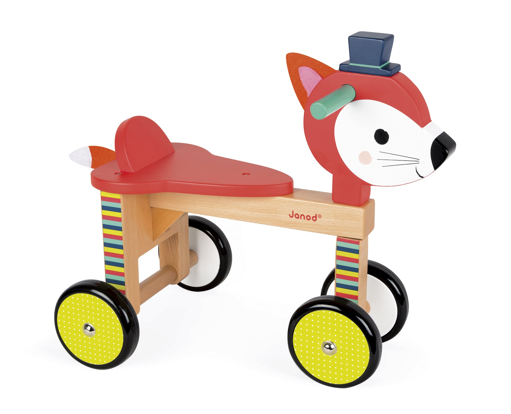 Αυτό το όμορφο παιχνίδι σε σχέδιο αλεπούς θα βοηθήσει το παιδί να αναπτύξει τις κινητικές του δεξιότητες και την ισορροπία του. Θα γίνει ο ιδανικός σύντροφος για να μάθει το παιδί να ισορροπεί και να ανακαλύψει τον κόσμο γύρω του. Οι τέσσερις λαστιχένιοι τροχοί του παιχνιδιού εξασφαλίζουν ασφάλεια και σταθερότητα στη σέλα. Ύψος καθίσματος: 22,8 εκ. Ξύλινο παιχνίδι (χρωματιστά μέρη από MDF και μέρη σε φυσικό χρώμα από συμπαγές ξύλο). Βασική βαφή και με εκτύπωση θερμοτυπίας. Πωλείται σε κλειστό κουτί με πλαστική λαβή.