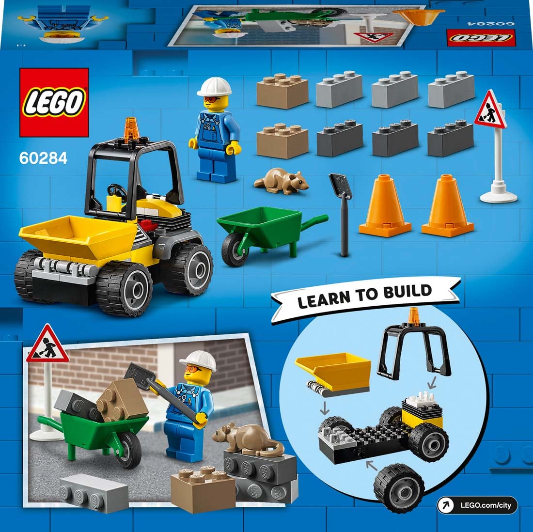 Βοήθησε τον εργάτη της LEGO® City να διατηρήσει τους δρόμους σε άριστη κατάσταση. Οδήγησε τον τρομερό φορτωτή στη θέση του και τοποθέτησε τους κώνους κυκλοφορίας και την πινακίδα οδικών έργων. Μπλιαχ! Ένας αρουραίος! Βοήθησε να μετακινηθεί το αυθάδικο τρωκτικό μακριά, και μετά πιάσε το φτυάρι και το καροτσάκι και στρώσου στη δουλειά. Χρησιμοποίησε τον κάδο του φορτηγού για να μεταφέρεις τα βαριά μπάζα, κι όταν τελειώσεις, φόρτωσε τα εργαλεία σου και ξεκίνα για την επόμενη δουλειά!
