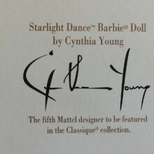 Η κούκλα Starlight Dance ™ Barbie® φορά μια λευκή μεταξωτή κρεπ φόρεμα με λαμπερά σιφόν πάνελ και βολάν που αναδεικνύουν την πλευρά του φορέματος. Οι αφρώδεις κρύσταλλοι στρας τονίζουν το απόλυτο μπούστο και τονίζουν την ομορφιά του σαρωτικού σχεδιασμού. Τα αφρώδη αξεσουάρ της περιλαμβάνουν βραχιόλια, σκουλαρίκια και ένα ευφάνταστο στήριγμα κεφαλής, ενώ τα εντυπωσιακά μαλλιά της μεταφέρονται σε μια δραματική επένδυση.